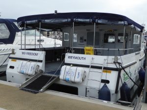 MV Freedom is a motor catamaran; that is to say she has two hulls and is powered by engines.